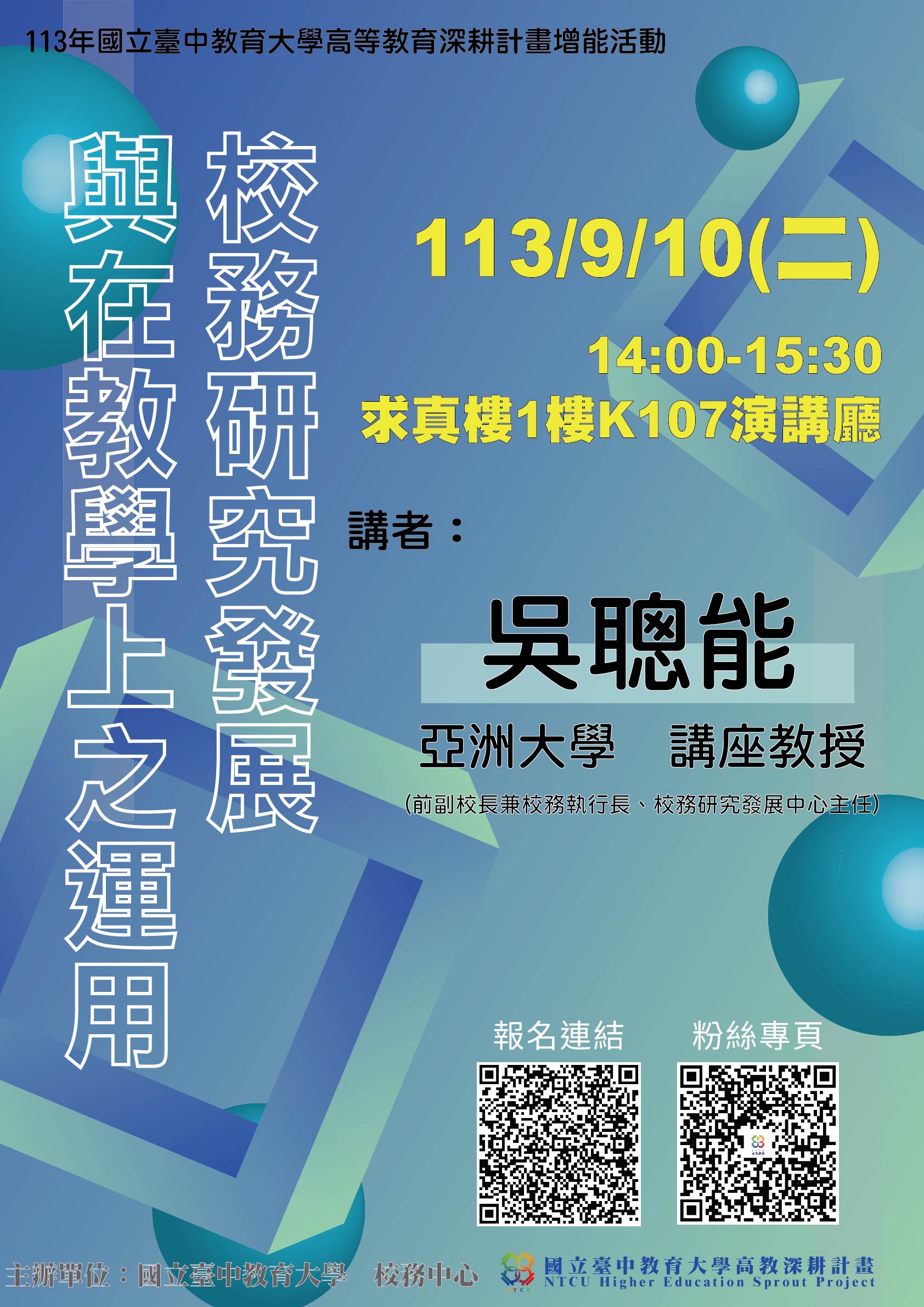 本中心舉辦113年高等教育深耕計畫增能活動-「校務研究發展與在教學上之運用」講座,歡迎本校師生踴躍報名參加。