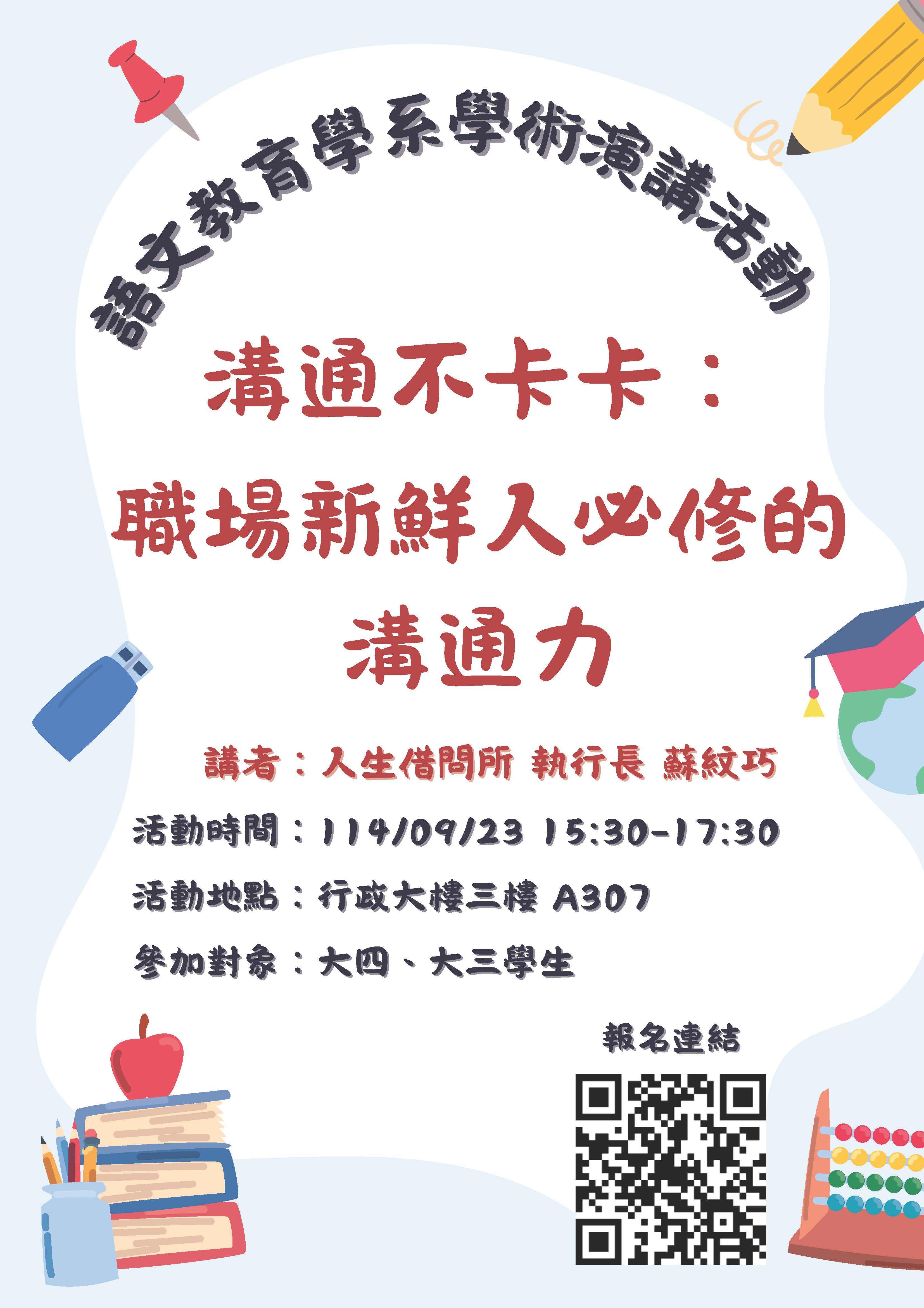 本校語文教育學系於9月23日下午,特別為大三與大四的同學舉辦一場學術演講,邀請「人生試問所」執行長蘇紋巧,以「溝通不卡卡:職場新鮮人必修的溝通力」為題,與學生分享如何掌握有效的溝通技巧。本次活動不僅著重於強化學生的心理健康與溝通知能,更希望協助同學在即將踏入職場前,裝備必要的軟實力,提升未來的競爭優勢。