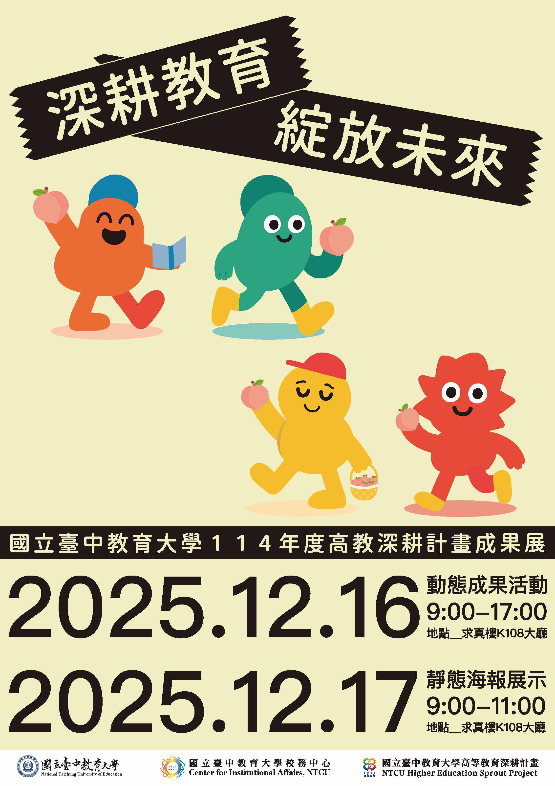本校校務中心謹訂於114年12月16日(星期二)至12月17日(星期三)舉辦114年度國立臺中教育大學「深耕教育 綻放未來」高教深耕計畫成果展,敬邀本校師生踴躍參與