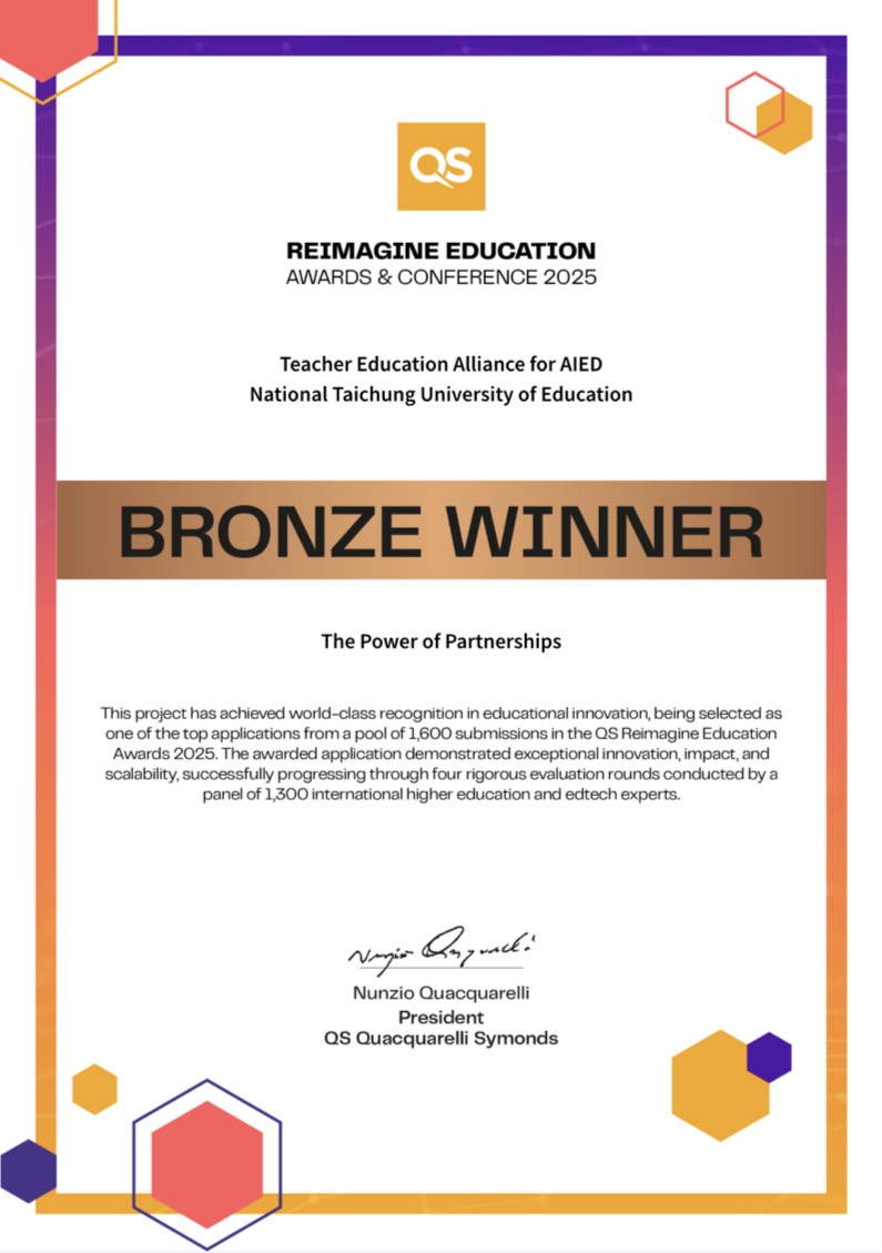 本校智慧教育師資培育聯盟於英國倫敦榮獲2025年QS全球教學創新大獎(Reimagine Education)「教育合作卓越」組獲得銅牌獎。此大獎被譽為「教育界的奧斯卡」,今年發表與頒獎典禮12月3日於倫敦舉行,用於肯定具體提升學習成效,發展具創新性的教學方法的團隊,本校所推動的智慧教育師培聯盟能在國際大賽中獲獎,顯示此聯盟的合作創新經驗已經成為一個新典範。