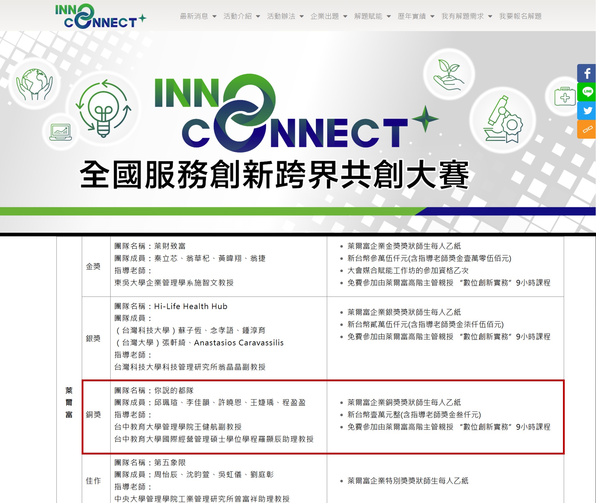 「InnoConnect+」競賽是由社團法人台灣服務科學學會主辦,旨在搭建大專院校與企業間的橋樑,由企業出題、學生解題。獲得銅獎的隊伍不僅抱回萬元獎金,亦受邀參加由萊爾富高階主管親自授課的「數位創新實務」課程,展現本校學生的分析能力已與產業界需求接軌,縮短了學用落差。